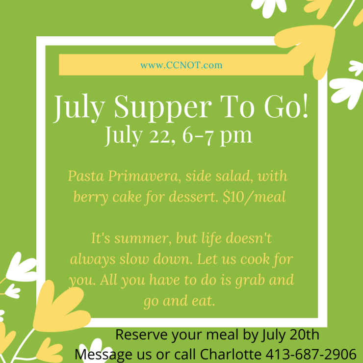 July 20, 2021Charlotte WeltzinLeave a Comment on Thursday Supper Thursday Supper Today is the last day to order a meal for Thursday evening pick up between 6-7pm. Share this: Click to share on Facebook (Opens in new window) Facebook Click to email a link to a friend (Opens in new window) Email Like Loading... Related
