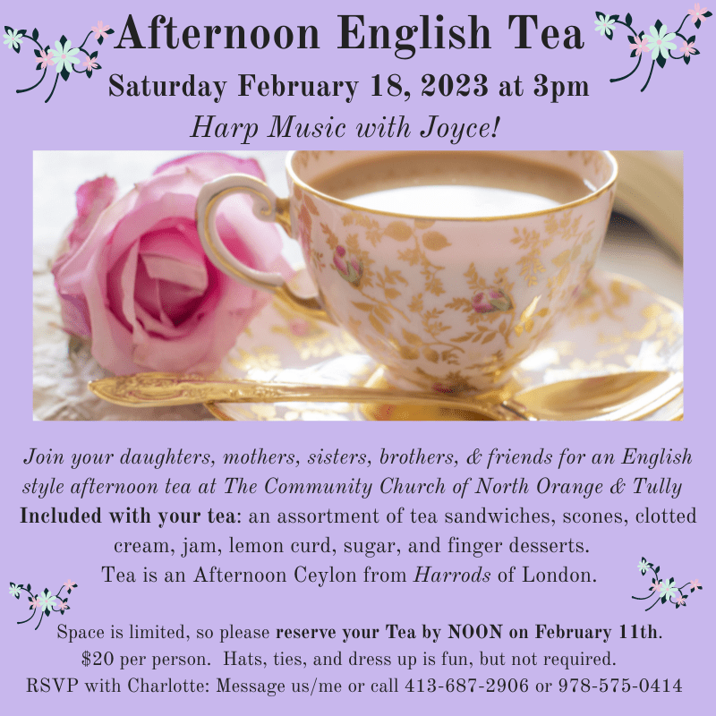 It’s Afternoon Tea Time. Join us for tea, music, and good company at the Community Church of North Orange and Tully. RSVP required…everyone is welcome to join us.