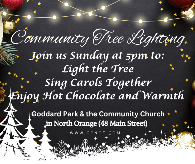 Every year, on the first Sunday in December, we gather together as Neighbors, Friends, Family, and Community to Light the Tree on Goddard Park. Join us for Carols, Lights, and the Feeding of the Birds. We’ll find warmth and comfort with hot chocolate and cookies in the Church/Meetinghous following. Bring your kids. Bring yourselves. Bring your friends. ALL are Welcome!!