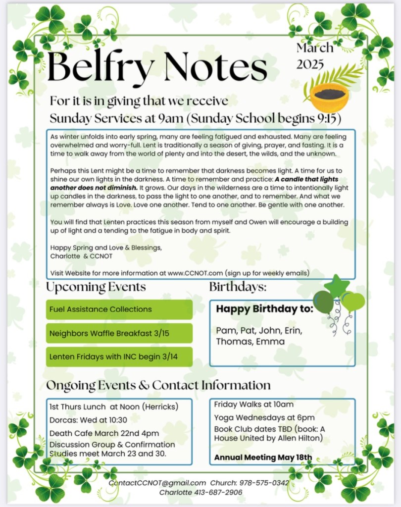 March 2, 2025Charlotte WeltzinLeave a Comment on March Belfry Notes March Belfry Notes Share this: Click to share on Facebook (Opens in new window) Facebook Click to email a link to a friend (Opens in new window) Email Like Loading... Related