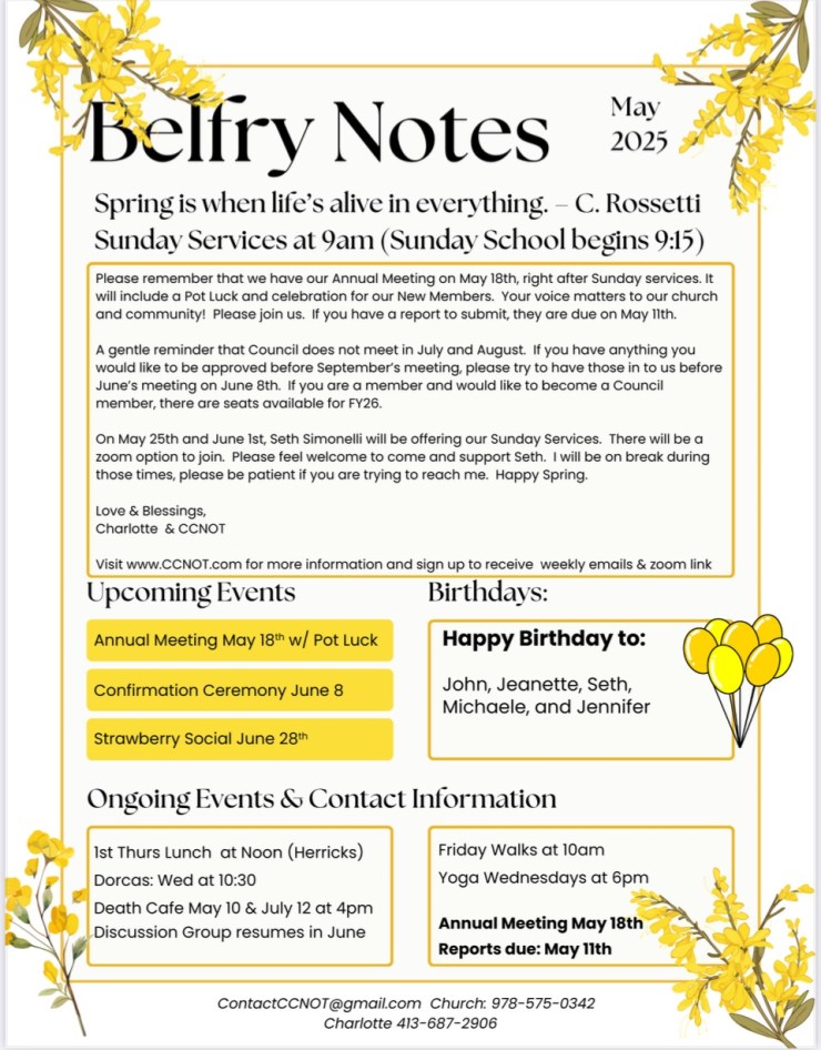 April 27, 2025April 26, 2025Charlotte WeltzinLeave a Comment on May Belfry Notes May Belfry Notes Share this: Click to share on Facebook (Opens in new window) Facebook Click to email a link to a friend (Opens in new window) Email Like Loading... Related